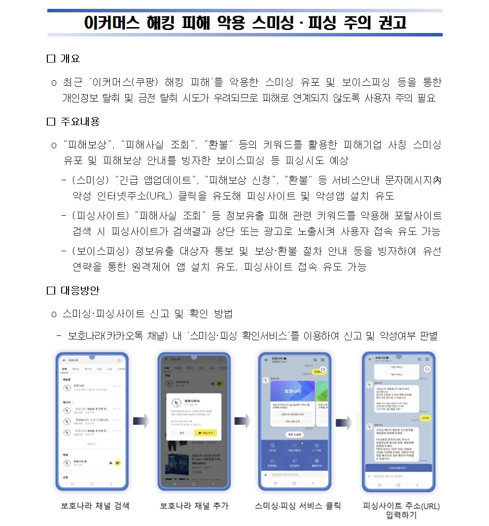 제목 이커머스 해킹 피해 악용 스미싱·피싱 주의 권고